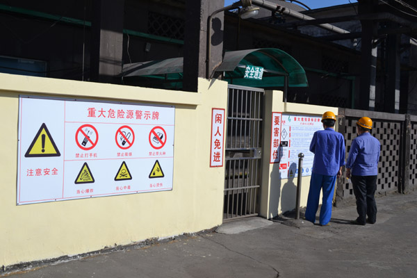 圖為該車間員工在辨識重大危險源告知牌。